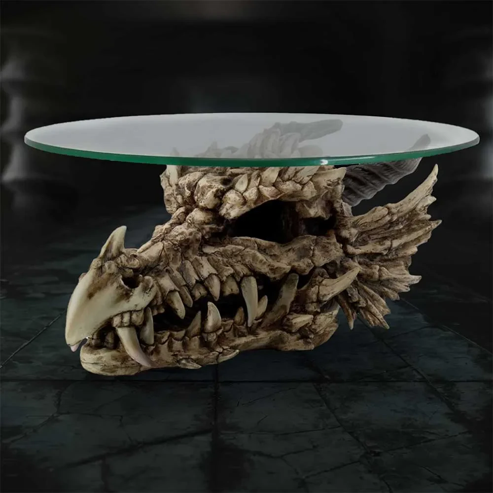 Un accessorio per la casa spettacolare e gotico, con un piano rotondo in vetro che poggia su un realistico teschio di drago finemente scolpito.